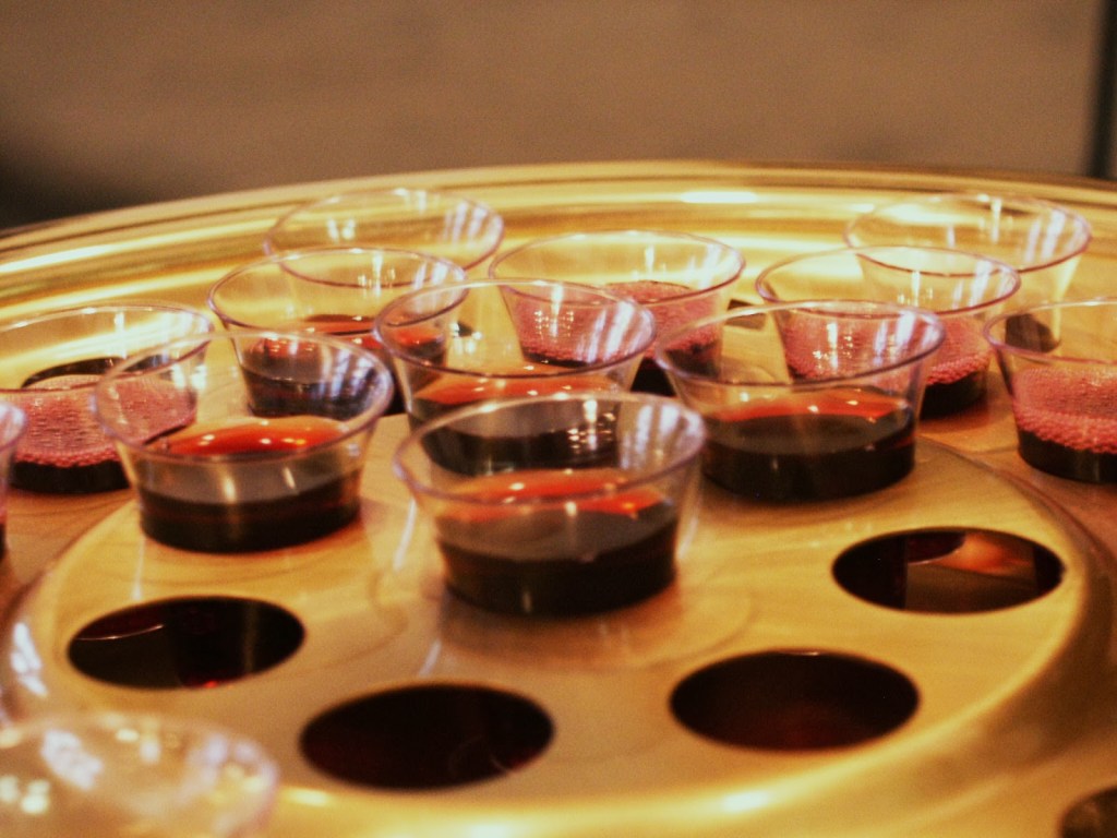 One week, we decided to share the act of communion with the attendees. Communion is voluntary, of course, but we wanted to make it available. I had only attended a Methodist church for about a year, so intinction was still new to me at that time. Most of the attendees were from other backgrounds and many had never seen it either. As I moved forward, I overheard a woman behind me whispering to her family. “They don’t have the little shot glasses.”